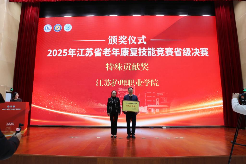 12月4日至6日,由省卫健委、省老龄办联合主办,省人社厅指导,江苏护理职业学院、省康复医学会、省老年健康服务指导中心承办的2025年江苏省老年康复技能竞赛在我校举办。省卫健委副主任、省中医药管理局局长朱岷,省民政厅副厅长、一级巡视员邱泽森,省人社厅二级巡视员金松,校党委书记陆志群,党委副书记、院长傅玉峰出席颁奖仪式。
