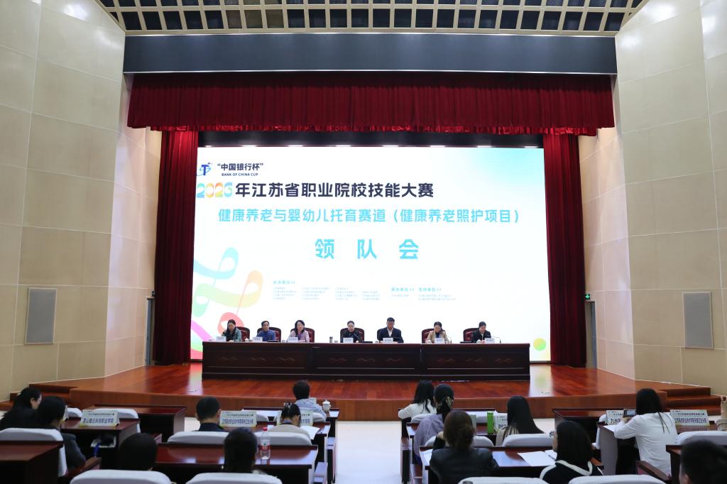 校党委副书记、院长傅玉峰在领队会上致辞。他指出,作为承办单位,江苏护理职业学院始终致力于老年健康事业发展,持续探索创新健康养老照护服务模式,提升专业技术水平。此次承办省级技能竞赛,既是对学校的激励,也是对工作的检验与鞭策。他希望以赛促学、以赛促建,为全省同行提供互学互鉴的平台,共同推动健康养老照护事业迈向更高水平。