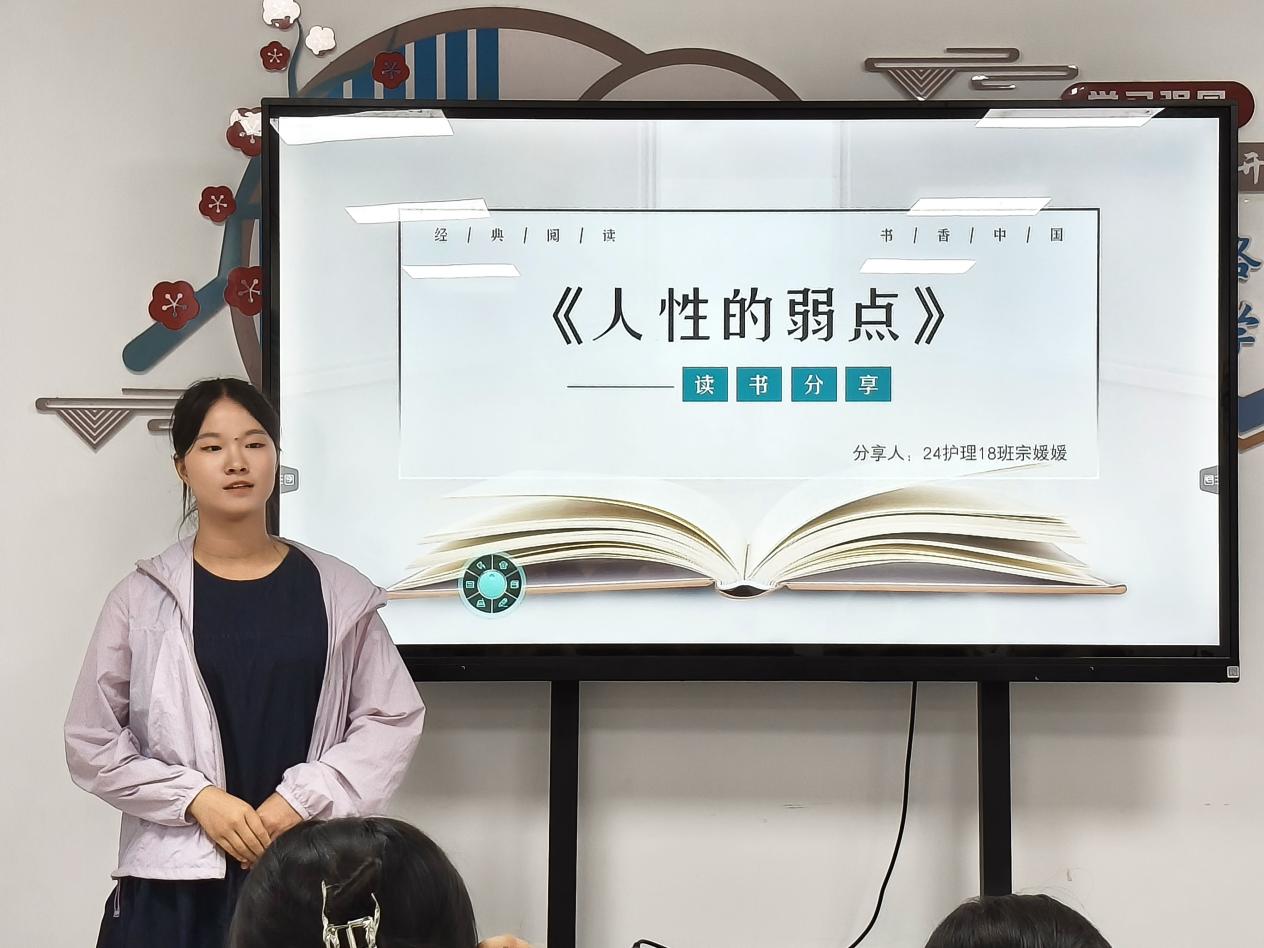 分享过程中,同学们或娓娓道来,或激情澎湃,用生动的语言和真挚的情感,将书中的精华展现得淋漓尽致。现场的互动交流也十分热烈,大家围绕着书中内容展开讨论,思想的火花不断碰撞。24护理18班的宗媛媛分享到:“作为新时代青年,我们要以技能为笔,以匠心为墨,在制造强国的征程中书写青春华章。”她结合书本《人性的弱点》,分享了如何更好地与人沟通、理解他人的技巧等,引发了在场同学的共鸣。