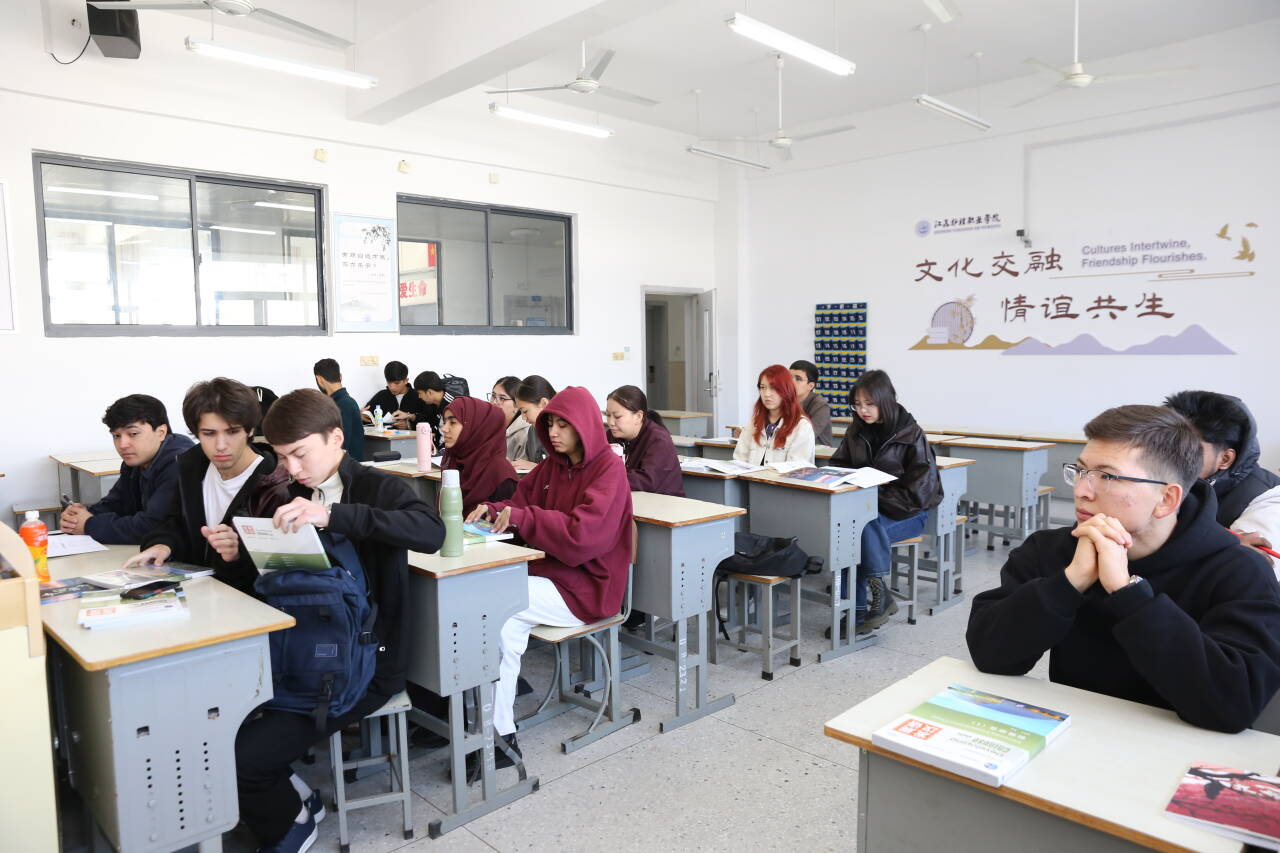 沉浸课堂:国际化教学正式启航。首批国际学生已进入公共基础课程学习阶段。在专为国际学生开设的课堂上,教师们采用适应性的教学方法,耐心讲授。国际学生们专注听讲,积极互动,在全新的教育环境中展现了良好的学习状态与求知热情。