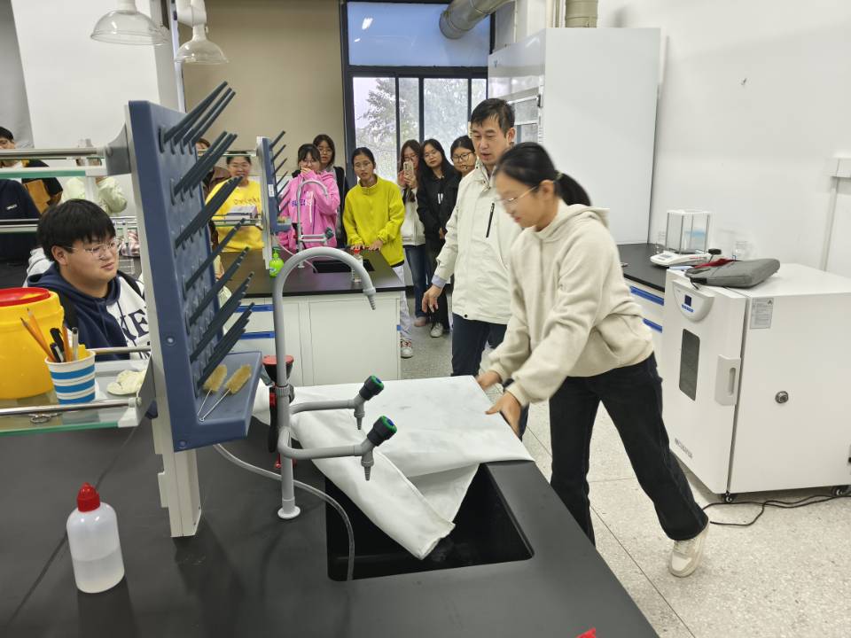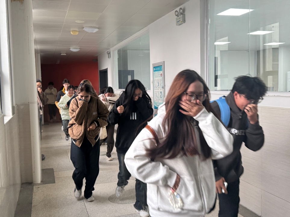 首先开展疏散演练。随着警报响起,演练正式开始。在教师与安全员的指引下,同学们迅速用湿毛巾捂住口鼻、低姿撤离,沿预定路线有序疏散至安全地带,过程高效有序。石庚生指出,演练有效检验了学院火灾应急预案的可行性,强调“安全演练绝非走过场”,要求全体师生将安全技能内化于心、外化于行,切实筑牢学院安全屏障。