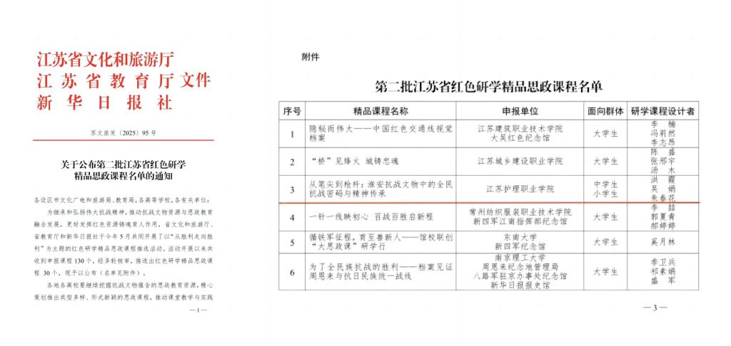 近日,由江苏省文化和旅游厅、省教育厅、新华日报社联合举办的“从胜利走向胜利”红色研学精品思政课程推选活动结果揭晓。本次活动共收到申报课程130个,经过多轮审核,最终推选出30个红色研学精品思政课程。我校马克思主义学院教师洪霞、吴娟、朱春花指导的《从笔尖到枪杆:淮安抗战文物中的全民抗战密码与精神传承》成功入选。