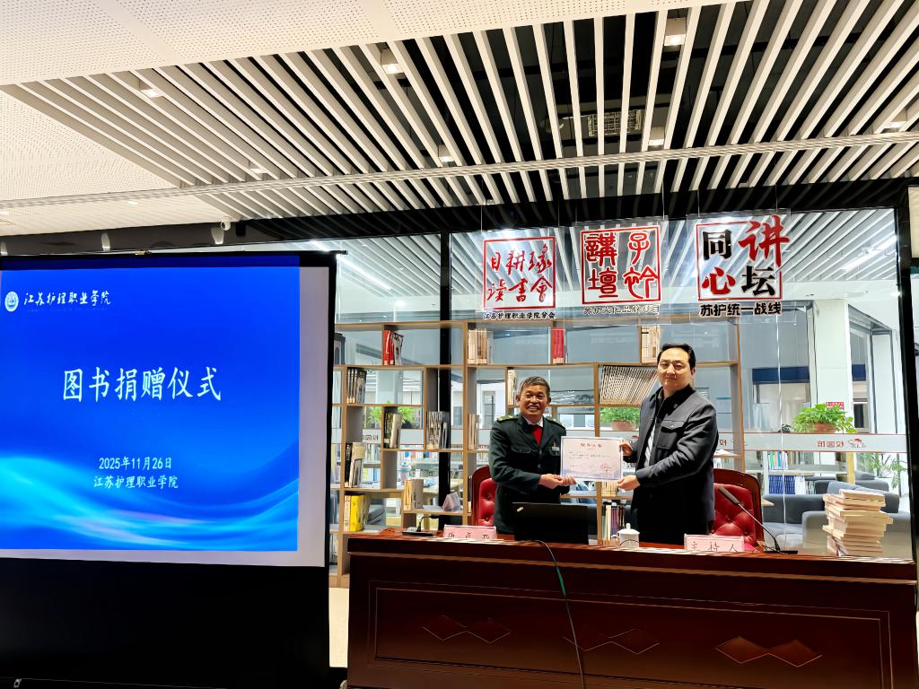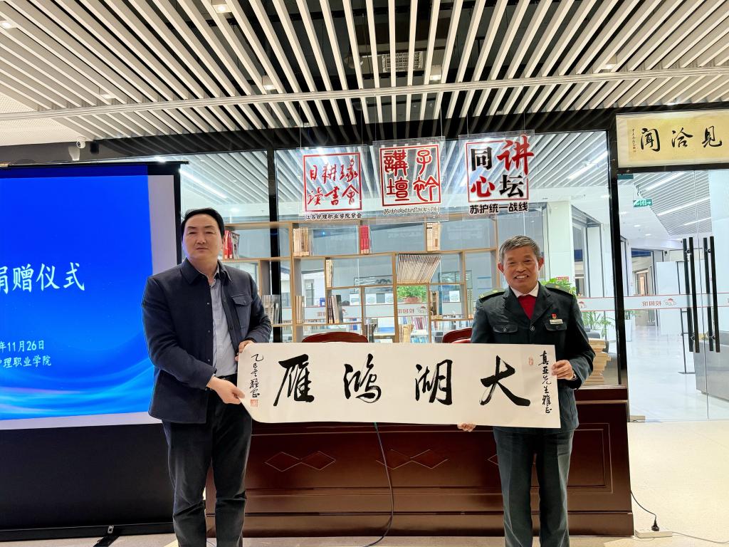 分享结束后,葛稳罡亲笔书写“大湖鸿雁”四字书法作品赠予唐真亚,以笔墨致敬他数十年如一日坚守邮路的工匠精神,更彰显了党建引领下不同岗位党员之间的相互认可与精神共鸣。随后,唐真亚代表邮政业务部党支部,向图书馆捐赠30本红色书籍,为图书馆的红色藏书增添新的力量,也为师生党员深化党建学习、传承红色基因提供了宝贵精神养料。