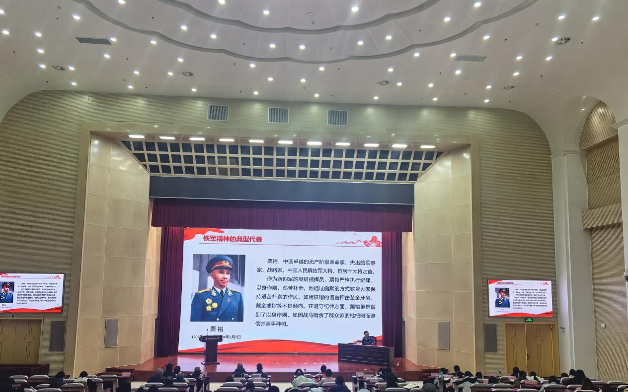 刘维荣老师从“铁军精神的形成发展、核心内涵、典型代表与时代价值”等四个方面,并结合珍贵历史档案与父辈战斗经历,生动阐释了新四军在抗日战争中不畏艰险、浴血奋战的革命故事,详细讲述了铁军精神从艰苦卓绝的战争环境中孕育而成,到成为凝聚民心、鼓舞斗志的强大力量的过程,通过一个个感人至深的英雄事迹,诠释了铁军精神的深厚底蕴。铁军精神不仅是中华民族宝贵的精神财富,更是新时代筑牢理想信念、强化使命担当的力量源泉。同时,刘维荣老师还勉励师生以史为鉴、砥砺前行,将铁军精神融入教育教学与学习实践中,为实现中华民族伟大复兴贡献智慧与力量。