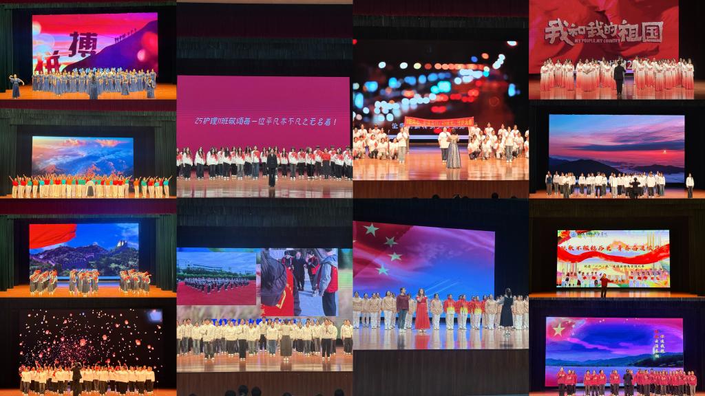 舞台上,同学们精神饱满、着装整齐,嘹亮歌声穿越时空,直抵人心。《歌唱祖国》节奏铿锵有力,唱出对家国山河的赤诚热爱;《我爱你中国》旋律昂扬向上,抒发对祖国的深情礼赞;《我和我的祖国》温情绵长,传递新时代青年的家国情怀。指挥者手势铿锵、收放自如,演唱者神情专注、声情合一,和声交织间,红色信仰愈发鲜明,台下掌声此起彼伏、久久不息。