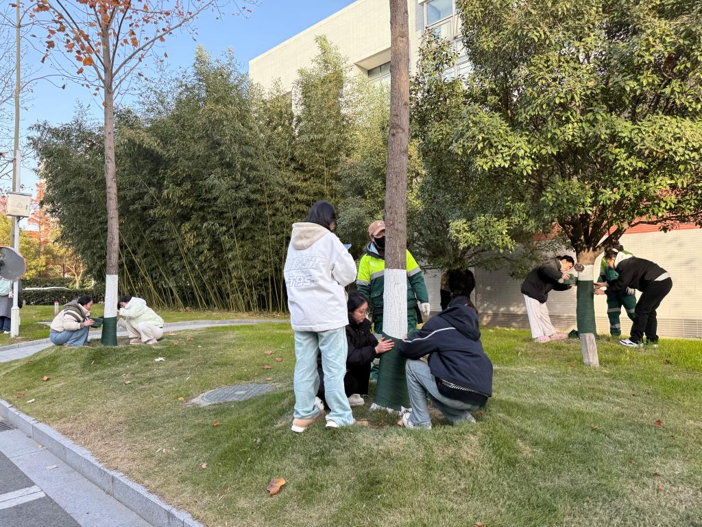 11月28日下午,一堂生动的生态文明建设实景微课堂在后勤楼楼前广场及附近区域举行——后勤保障党支部组织开展了以“为大树穿衣”为主题的党日活动,后勤保障党支部党员、入党积极分子,二级学院学生代表,驻校绿化养护人员参加活动。