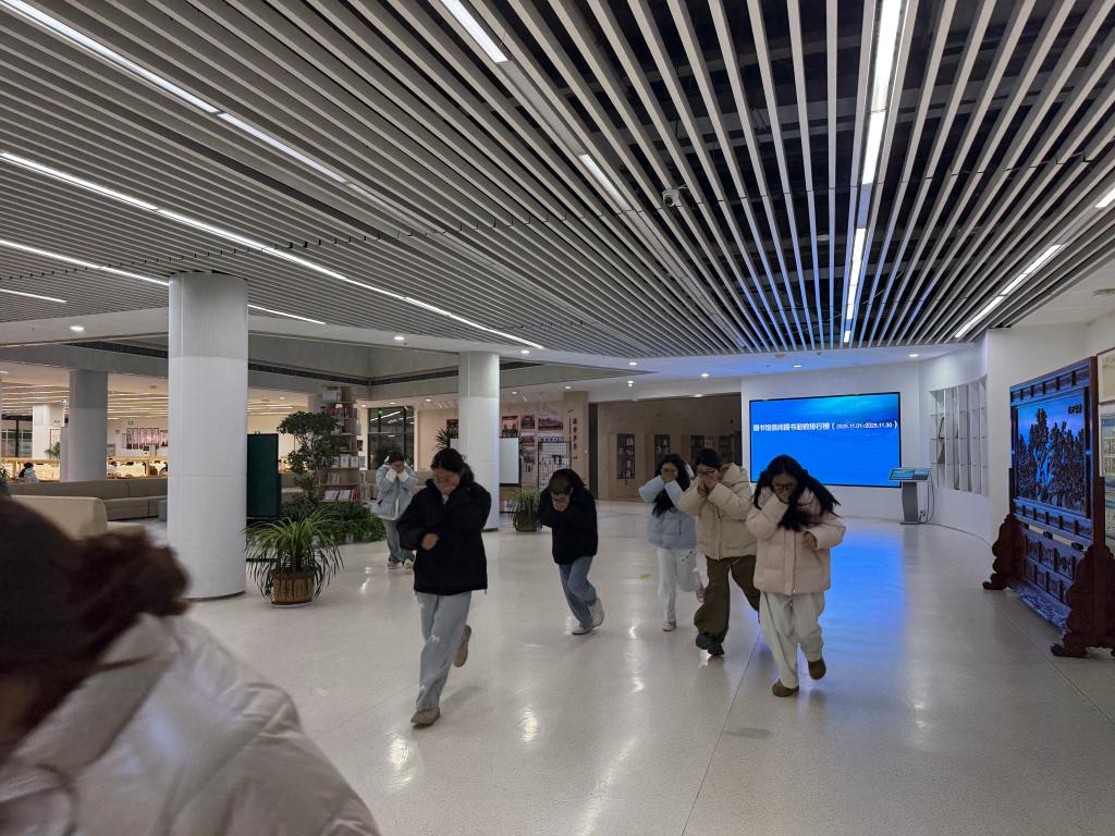 随着模拟火灾警报的骤然响起,实战疏散演练环节迅速启动。参演学生馆员立即进入应急状态,按照既定预案分工协作,迅速引导模拟读者用湿毛巾捂住口鼻,沿指定疏散路线低姿、快速、有序撤离。整个过程紧张而不慌乱,各环节衔接紧密,所有人员均在规定时间内安全撤离至馆外指定集结点,演练取得圆满成功。