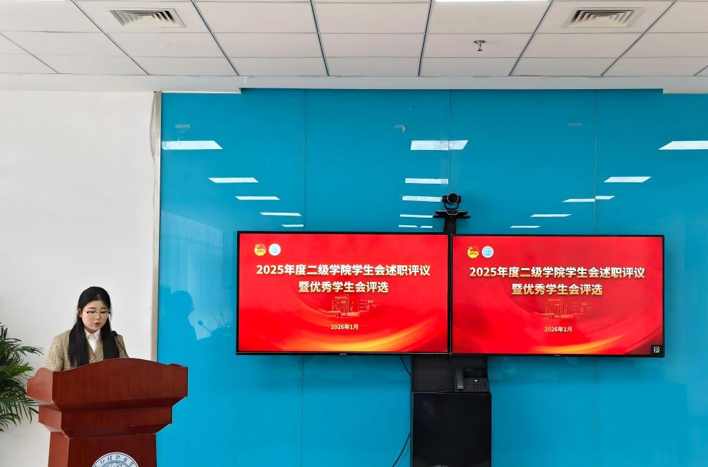 各二级学院学生会代表依次上台,围绕过去一年的重点工作、特色亮点、不足反思及未来规划进行了全面展示与汇报,聚焦思想引领、组织建设、服务同学、深化改革等方面,以翔实数据、丰富案例和生动讲述,展现了在强化政治导向、规范组织运行、践行服务宗旨、助力同学成长等方面取得的扎实成效,以及持续推进自身改革的决心与行动。