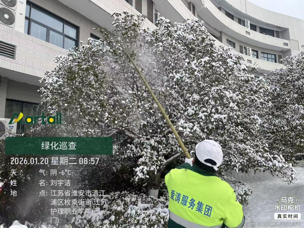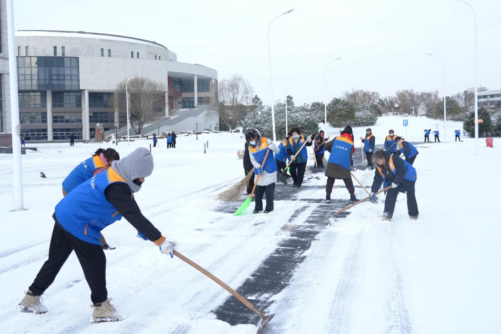 组织驻校物业、绿化养护人员紧急开展清雪除冰作业。1月20日7时左右,两个校区同步行动,物业、绿化人员通过撒盐、清扫等方式开展校园路面清雪除冰作业。截至上午10时,校内各主干道、重要人行道均完成清雪除冰,切实保障了全校师生出行安全顺畅。
