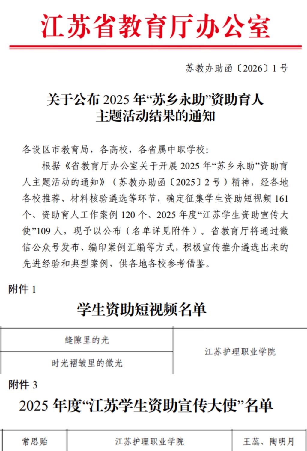 日前,江苏省教育厅组织开展的2025年“苏乡永助”资助育人主题活动评选结果公布,我校申报的三个项目荣获表彰,实现申报项目获奖率100%。其中,《缝隙里的光》与《时光褶皱里的微光》成功获评资助短视频;常思贻同学获评江苏省“学生资助宣传大使”。