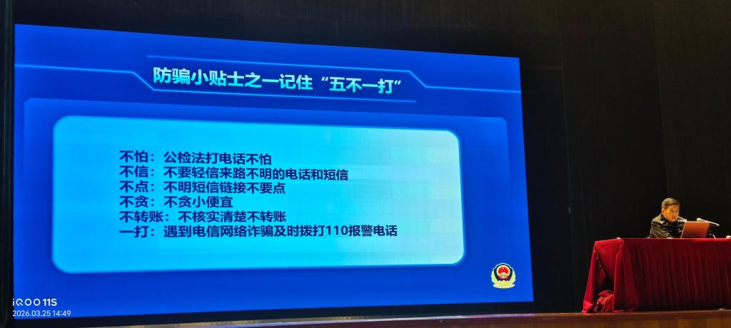 活动现场,康小波紧扣高校电信网络诈骗高发态势,以“以案释法、以案明纪”为核心,通过真实案例拆解,深入剖析刷单返利、冒充客服、游戏账号交易、“校园贷”等学生易遭遇的诈骗套路。他详细讲解诈骗分子的诱导话术、隐蔽手段及作案流程,重点提醒学生谨记“公检法打电话不怕、不要轻信来路不明的电话和短信、不明短信链接不要点、不贪小便宜、不核实清楚不转账、遇到电信网络诈骗及时拨打110报警电话”的“五不一打原则”,从源头防范诈骗风险。针对学生特点,他还重点警示网络兼职诈骗、冒充老师、亲友转账等高频骗局,结合学生群体的生活学习场景,传授实用防骗技巧。现场指导学生安装“国家反诈中心”APP,讲解来电预警、短信过滤等功能的使用方法,推动反诈防护工具全面覆盖、精准落地。