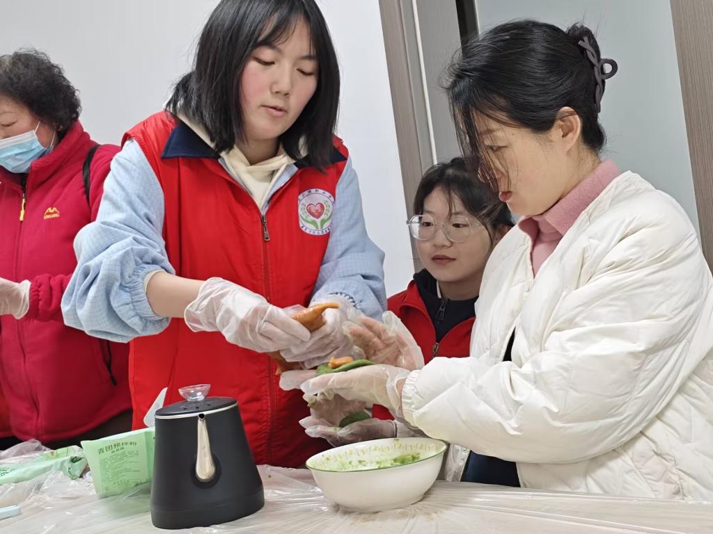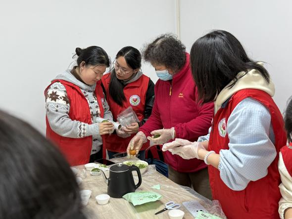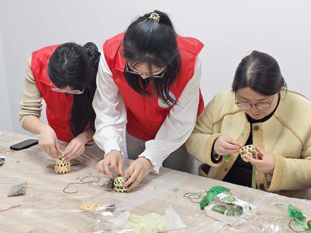 当日下午2时,营养保健协会与手工坊社团走进水沐云顶小区,开展“清明承古韵 巧手寄哀思”传统文化体验活动。现场设置了青团DIY与竹编香囊手作两大环节。在营养保健协会的指导下,同学们与社区居民一同揉面、包馅,亲手制作青团,共同聆听清明食俗与养生知识讲解,在动手实践中感受节日的烟火气息与文化底蕴。手工坊社团则组织大家编织竹篾、填充艾草,将非遗竹编技艺与清明防疫养生传统融入指尖创作,在一编一织间寄托对先烈的追思与对平安健康的美好祈愿。