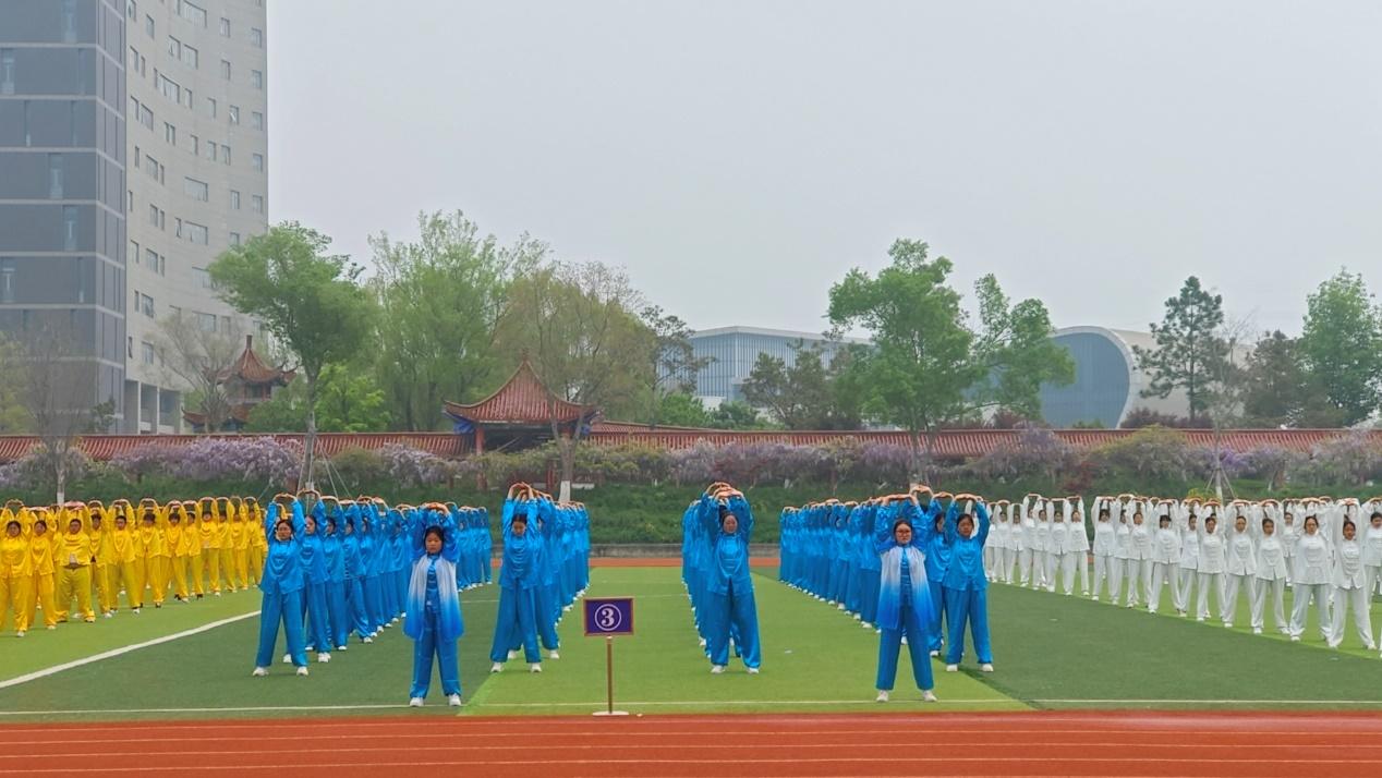 在八段锦项目中,80名队员整齐列阵,从“双手托天”到“背后七颠”,八式相连,动作一致。队员们呼吸平稳,掌随身动,队列如行云流水,成功获得八段锦比赛第二名。