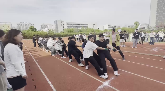 在拔河赛场上,20名男生队员脚踏实地、身向后倾,紧握长绳的双手青筋凸起,在震天呐喊中坚守拼搏,勇夺亚军。